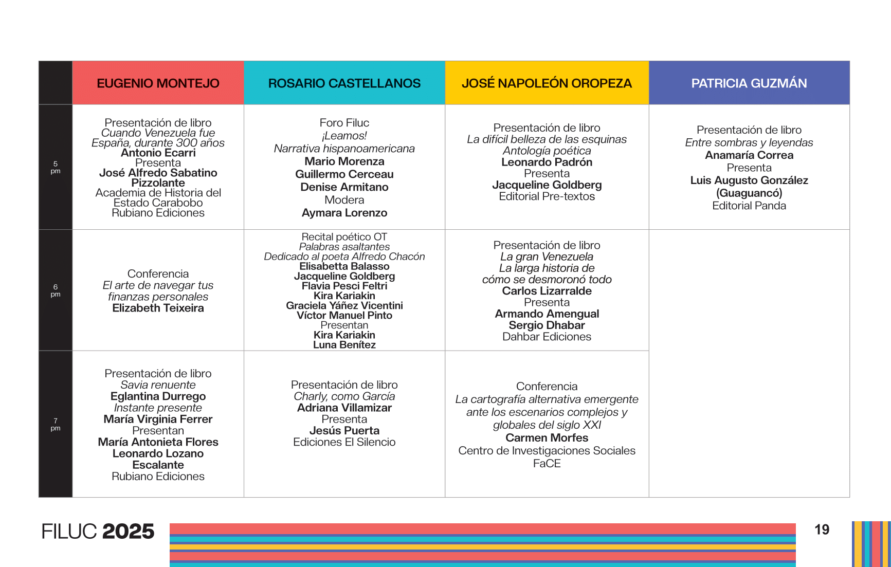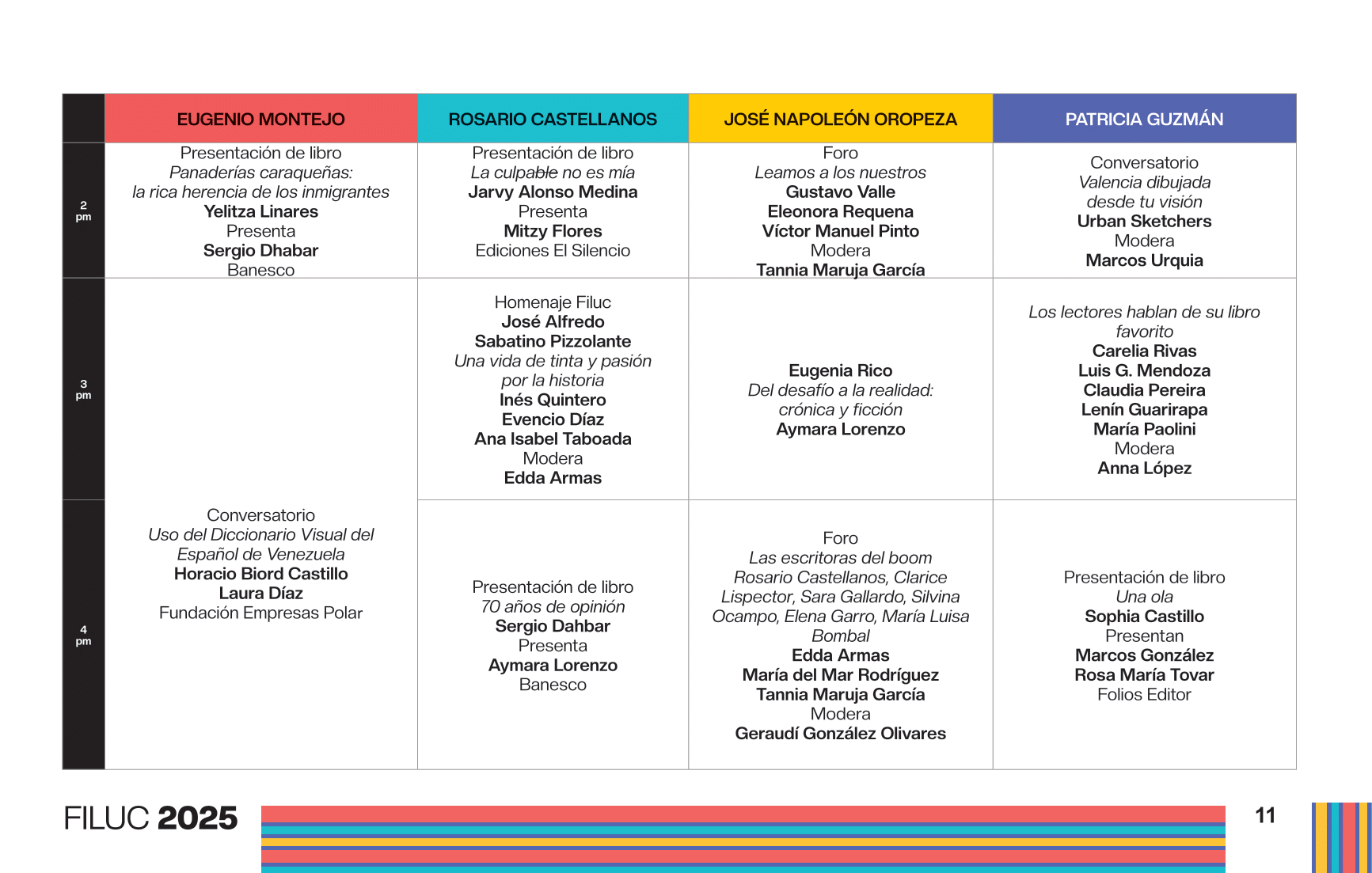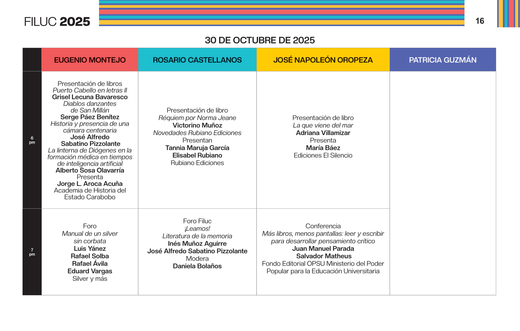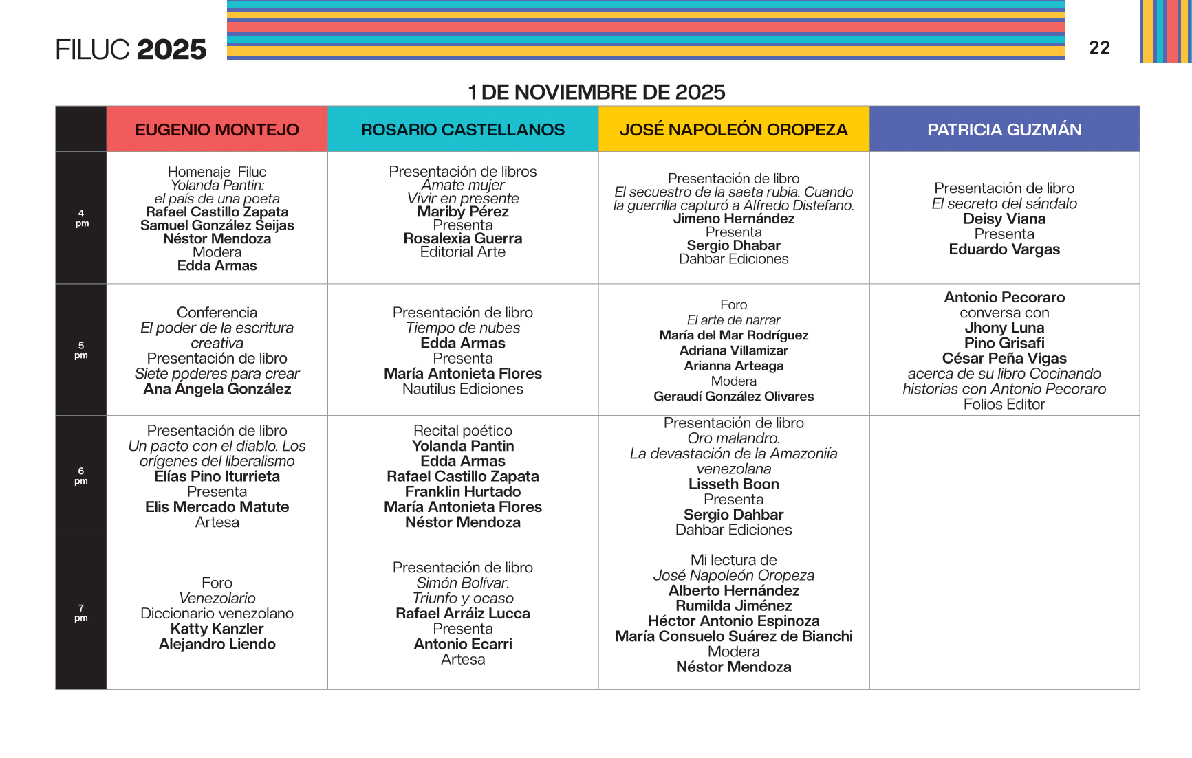 - 4:00 p.m. Libro 70 años de artículos de opinión en Venezuela, conversación dirigida por la periodista Aymara Lorenzo del podcast Con el oído en la letra, y con el editor Sergio Dahbar de la colección Periodismo de la Biblioteca Digital Banesco. Sala Rosario Castellanos.