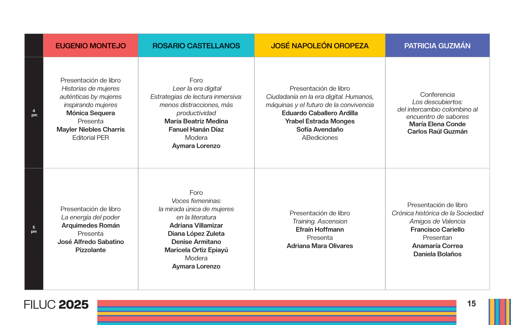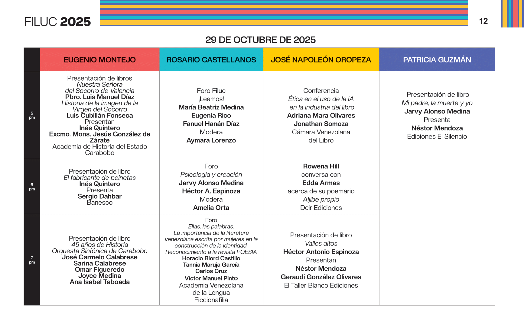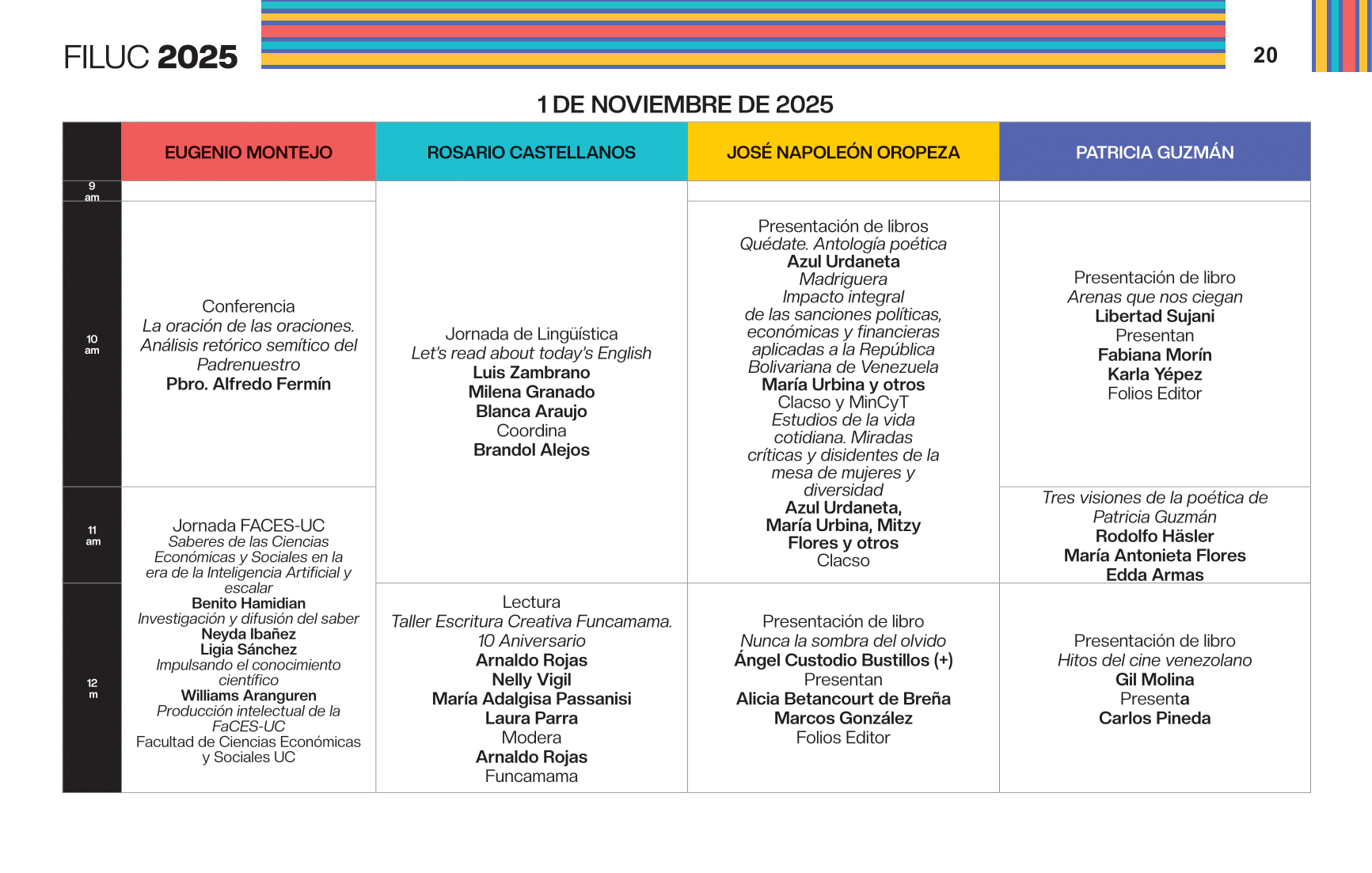 - 4:00 p.m. Libro 70 años de artículos de opinión en Venezuela, conversación dirigida por la periodista Aymara Lorenzo del podcast Con el oído en la letra, y con el editor Sergio Dahbar de la colección Periodismo de la Biblioteca Digital Banesco. Sala Rosario Castellanos.