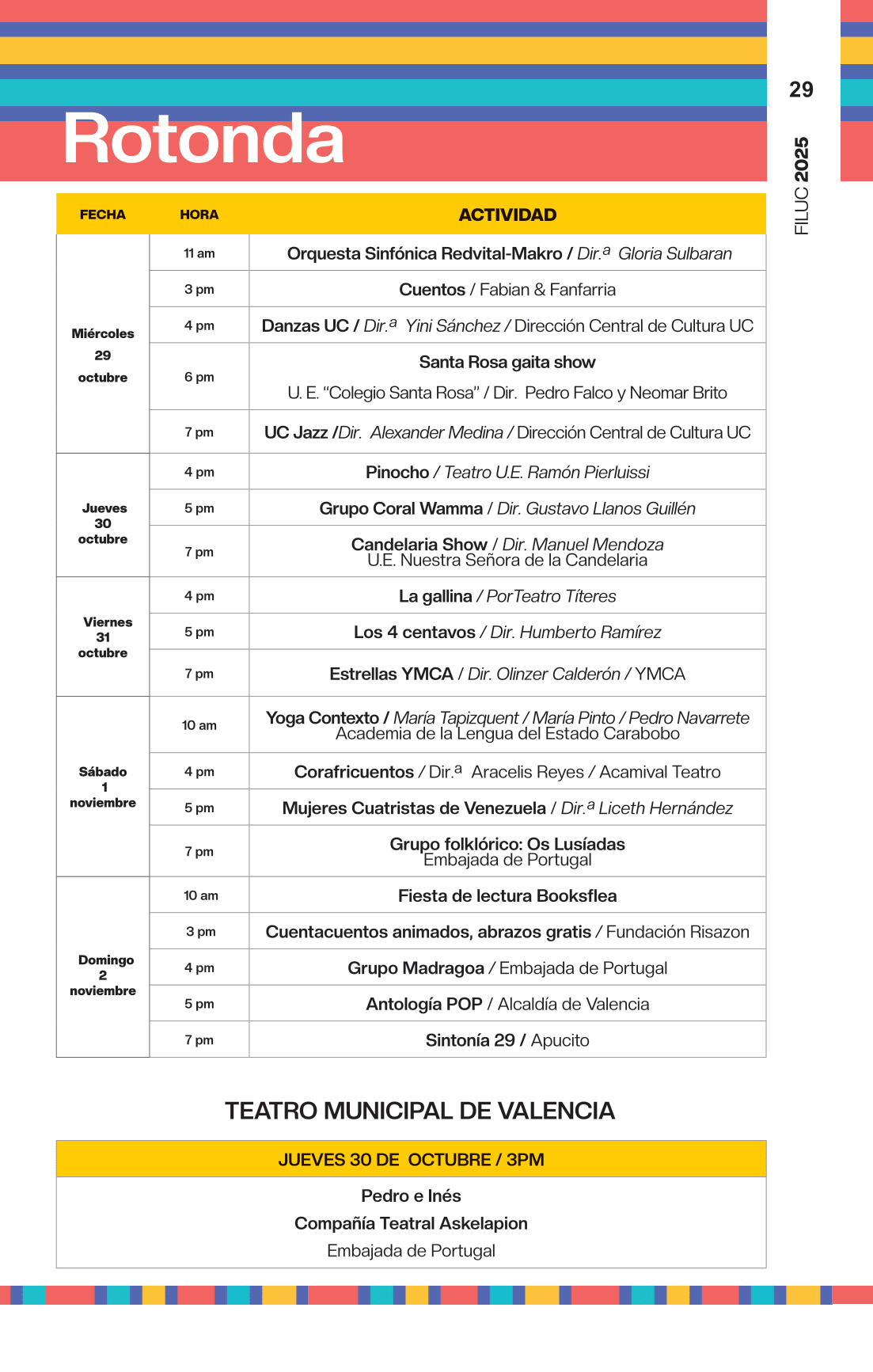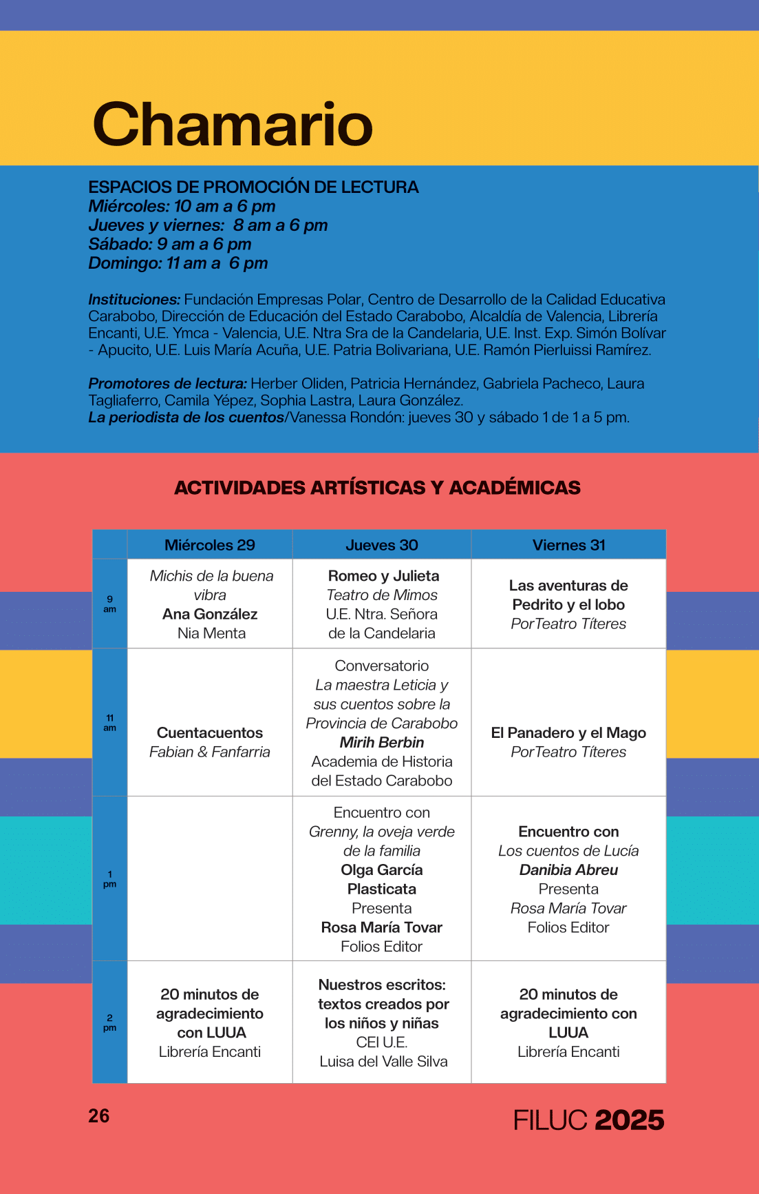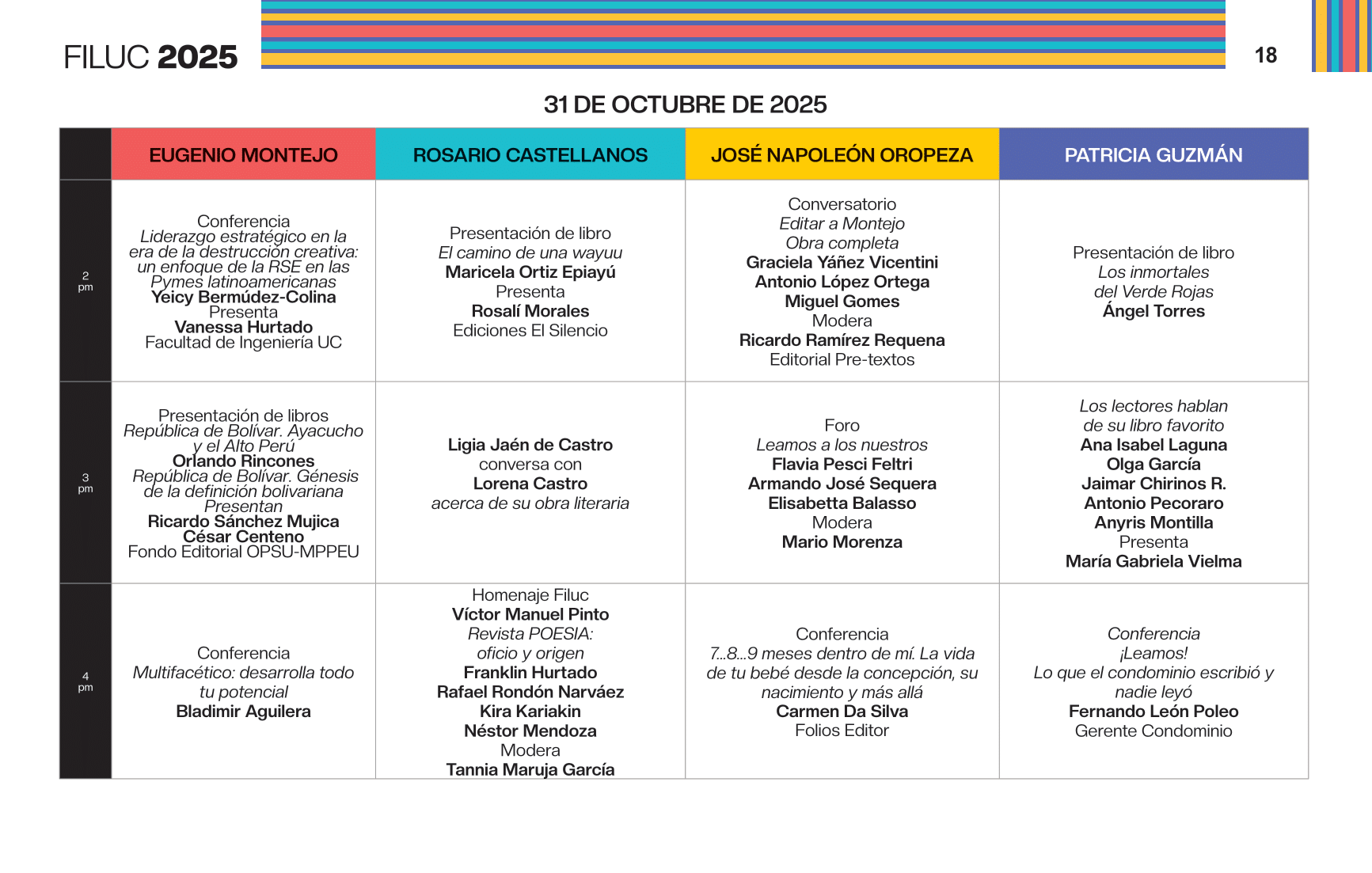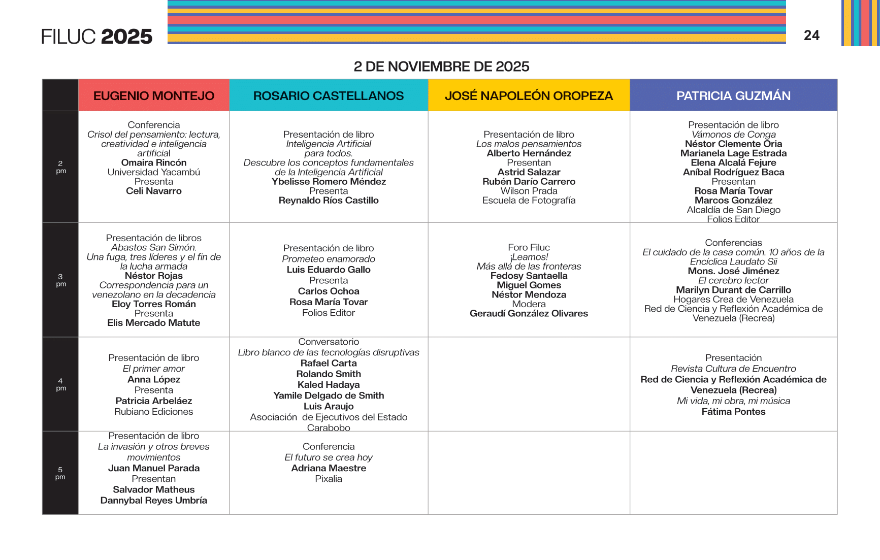 - 4:00 p.m. Libro 70 años de artículos de opinión en Venezuela, conversación dirigida por la periodista Aymara Lorenzo del podcast Con el oído en la letra, y con el editor Sergio Dahbar de la colección Periodismo de la Biblioteca Digital Banesco. Sala Rosario Castellanos.
