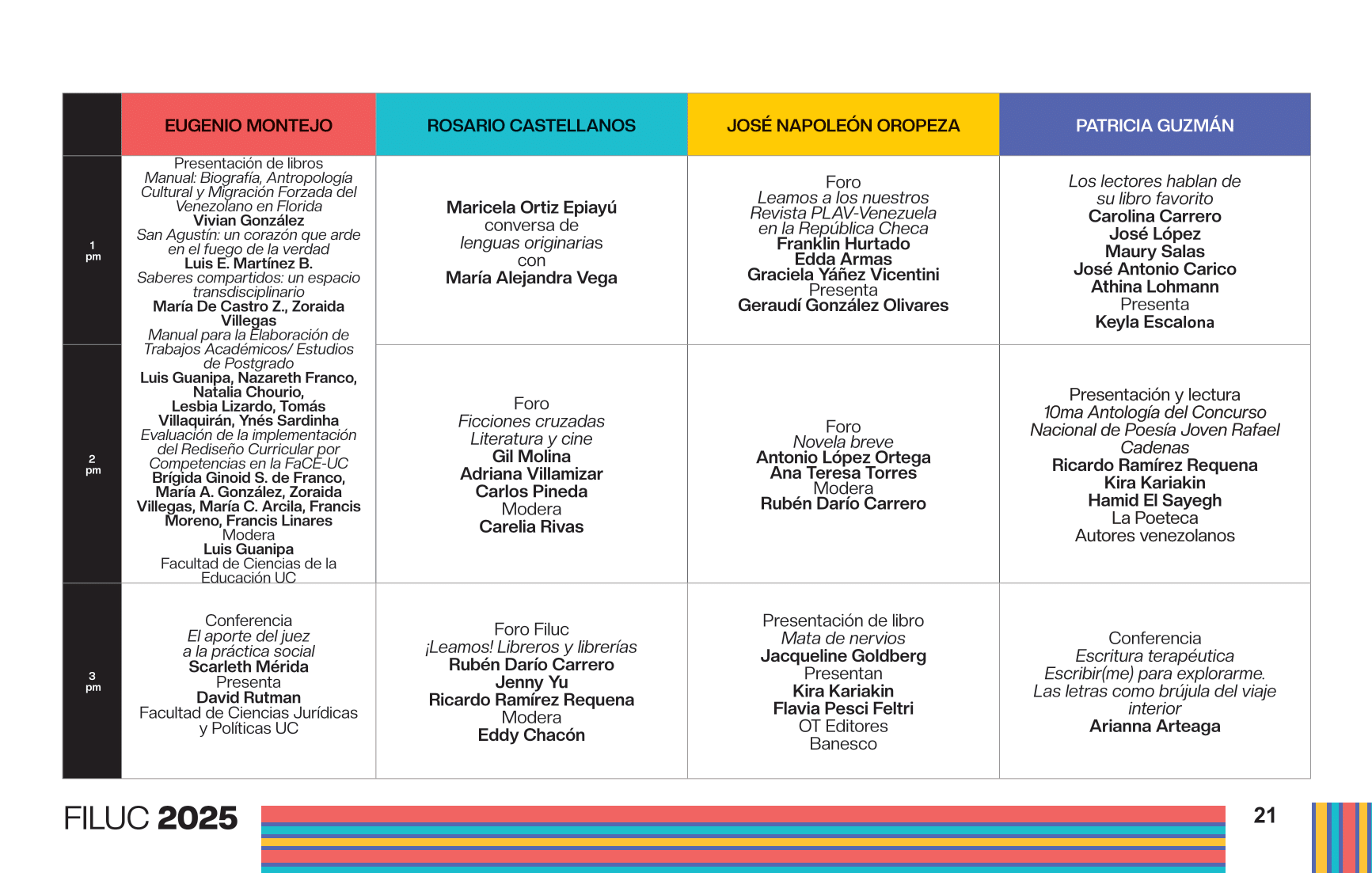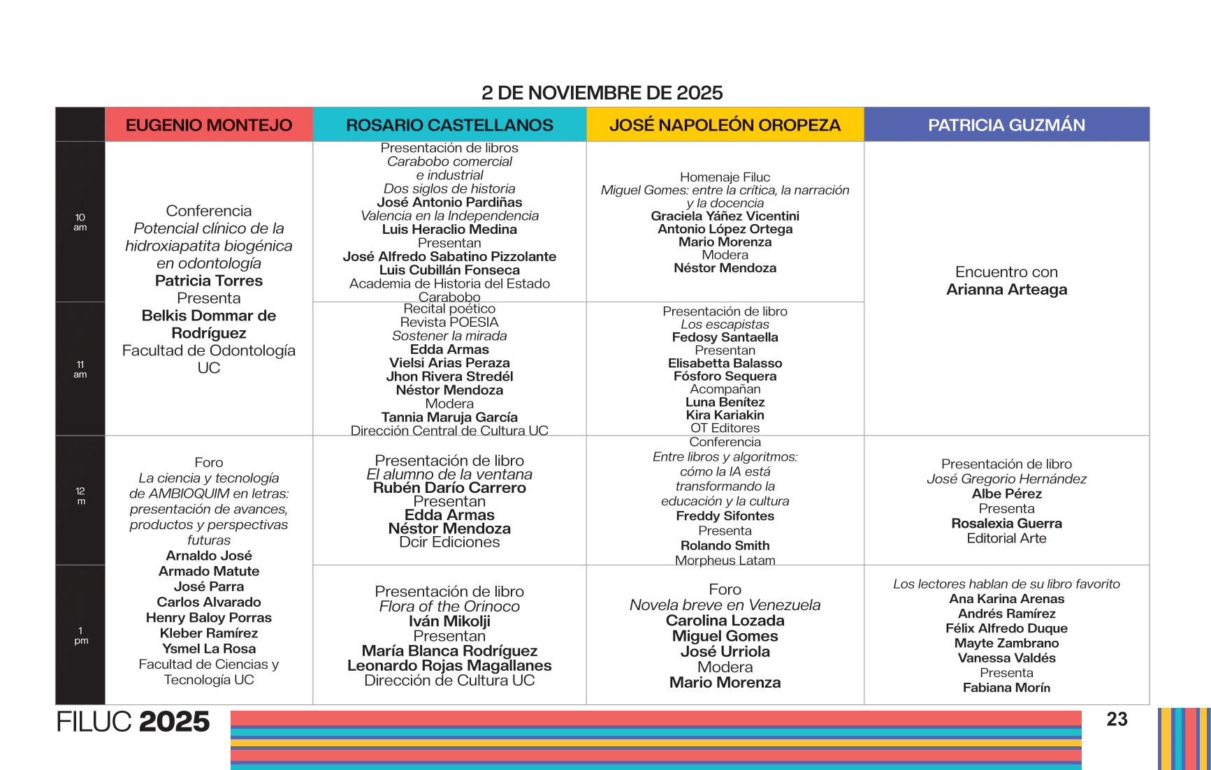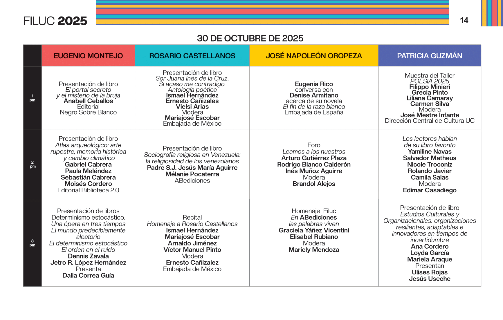 - 2:00 p.m. Presentación y lectura de la 10ma antología del Concurso Nacional de Poesía Joven Rafael Cadenas. Participan: Ricardo Ramírez Requena, director de La Poeteca; Kira Kariakin, jurado del 10mo Concurso Nacional de Poesía Joven Rafael Cadenas; y Hamid El Sayegh, finalista del concurso. Sala Patricia Guzmán.