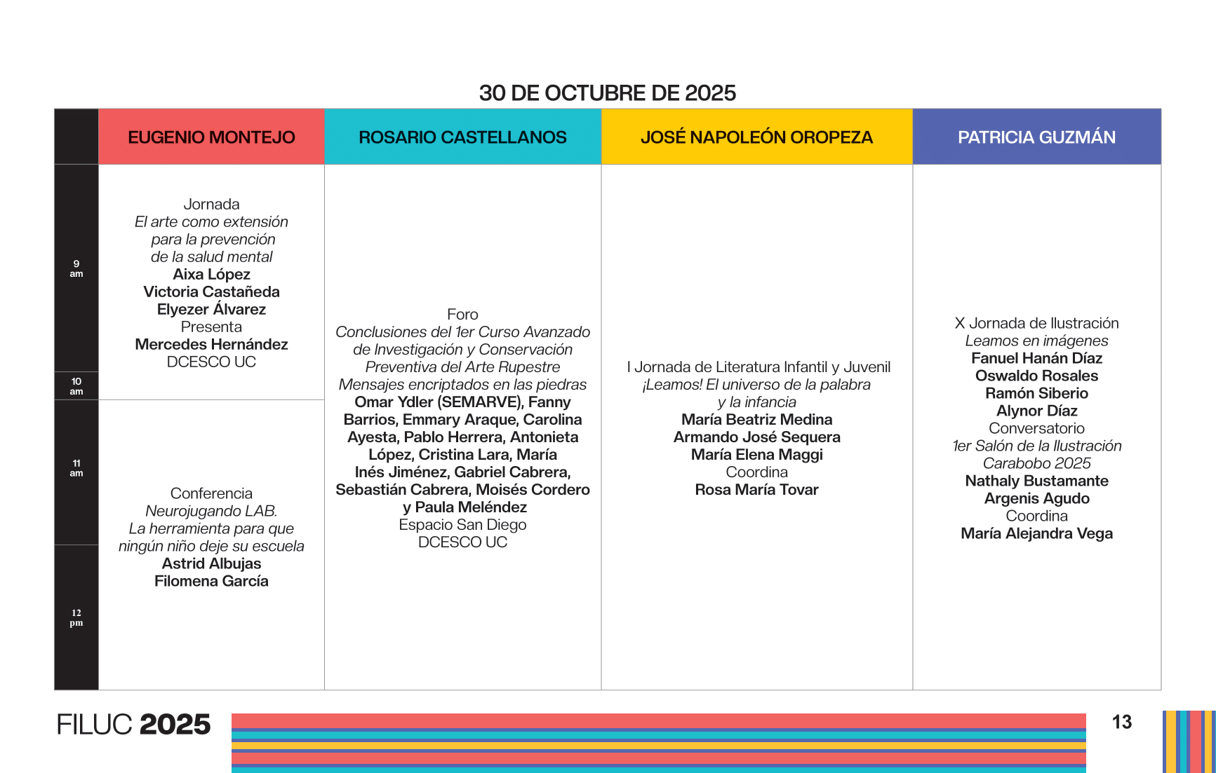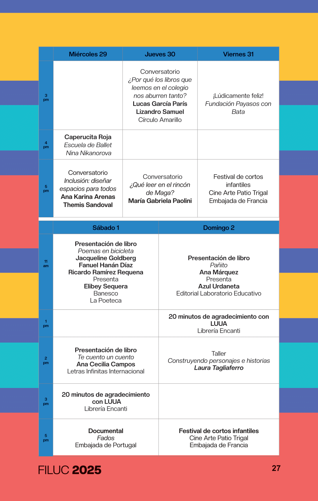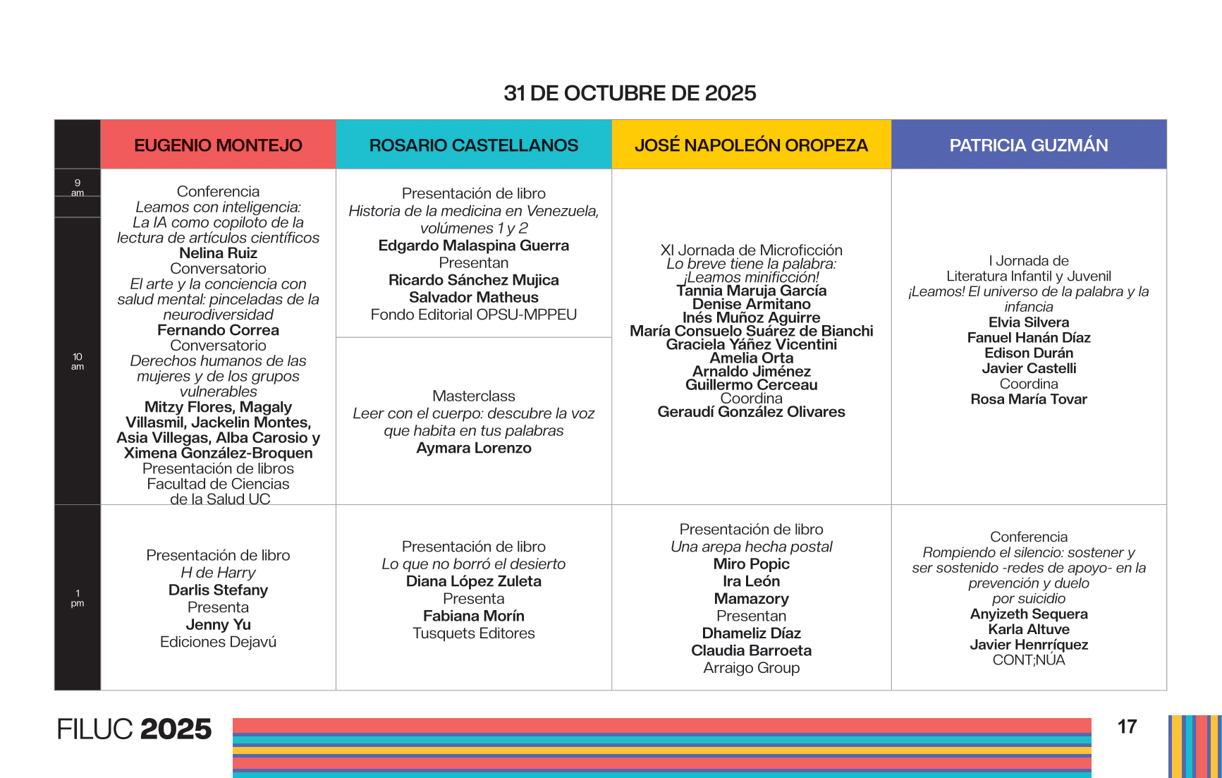 - 2:00 p.m. Presentación y lectura de la 10ma antología del Concurso Nacional de Poesía Joven Rafael Cadenas. Participan: Ricardo Ramírez Requena, director de La Poeteca; Kira Kariakin, jurado del 10mo Concurso Nacional de Poesía Joven Rafael Cadenas; y Hamid El Sayegh, finalista del concurso. Sala Patricia Guzmán.